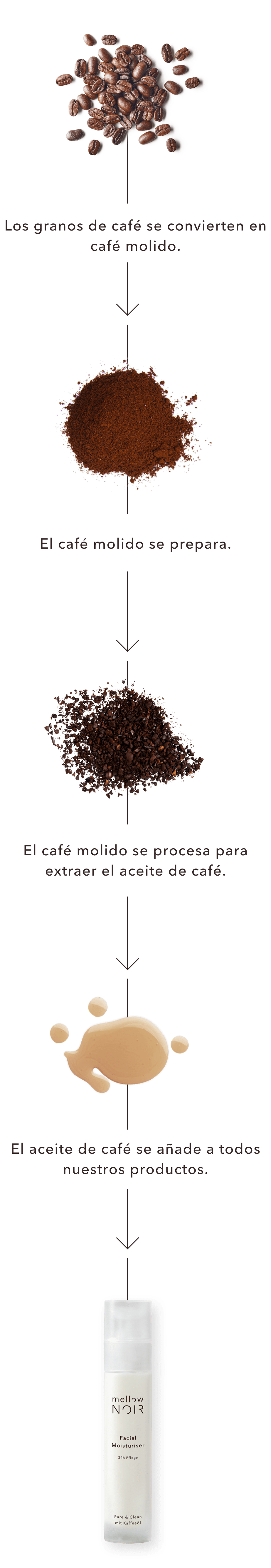 En nuestras fórmulas únicas combinamos una selección muy cuidadosa de ingredientes puros y altamente eficaces. La innovación cosmética, el aceite de café activo a partir de café 100 % usado, se enriquece en cada uno de nuestros productos con los principios activos más avanzados.